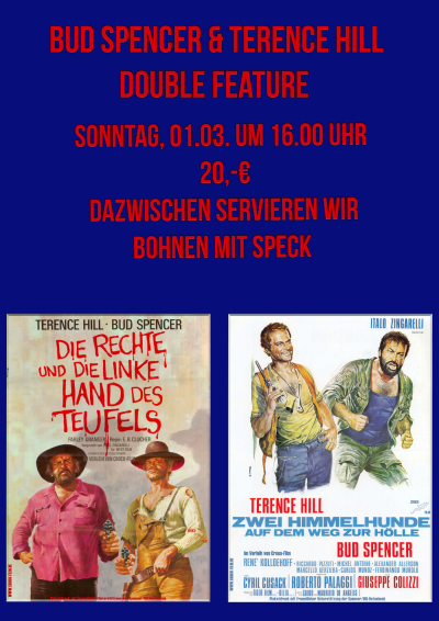 BUD SPENCER und TERENCE HILL FILMDOUBLE Wir laden zu unserem ersten BUD SPENCER & TERENCE HILL FILMDOUBLE. Wir starten mit DIE RECHTE UND DIE LINKE HAND DES TEUFELS und ZWEI HIMMELHUNDE AUF DEM WEG ZUR HÖLLE. In der Pause servieren wir Bohnen mit Speck. Links : BUD SPENCER und TERENCE HILL FILMDOUBLE « zurück